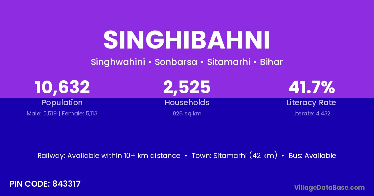 Sitamarhi (42 km) is the nearest town to Singhibahni village for major economic activities and is located approximately 42 km away.