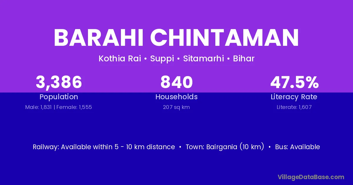 Bairgania (10 km) is the nearest town to Barahi Chintaman village for major economic activities and is located approximately 10 km away.