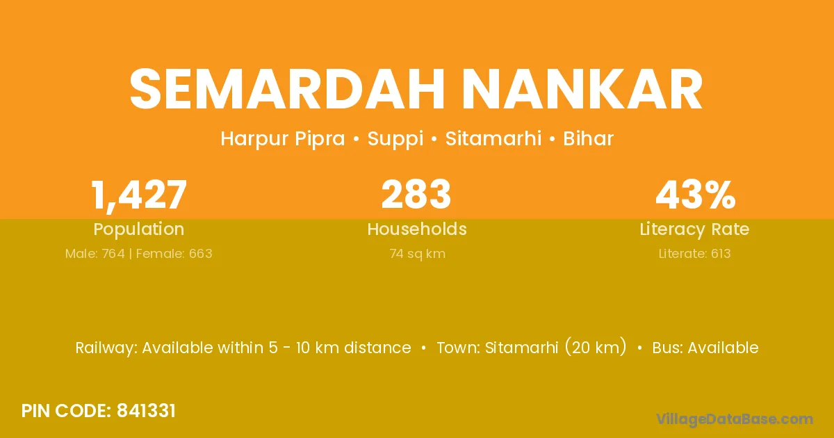 Sitamarhi (20 km) is the nearest town to Semardah Nankar village for major economic activities and is located approximately 20 km away.