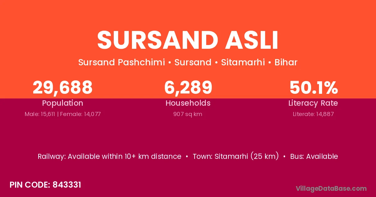 Sursand Asli village has a total population of 29,688 people, of which 15,611 are males and 14,077 are females.