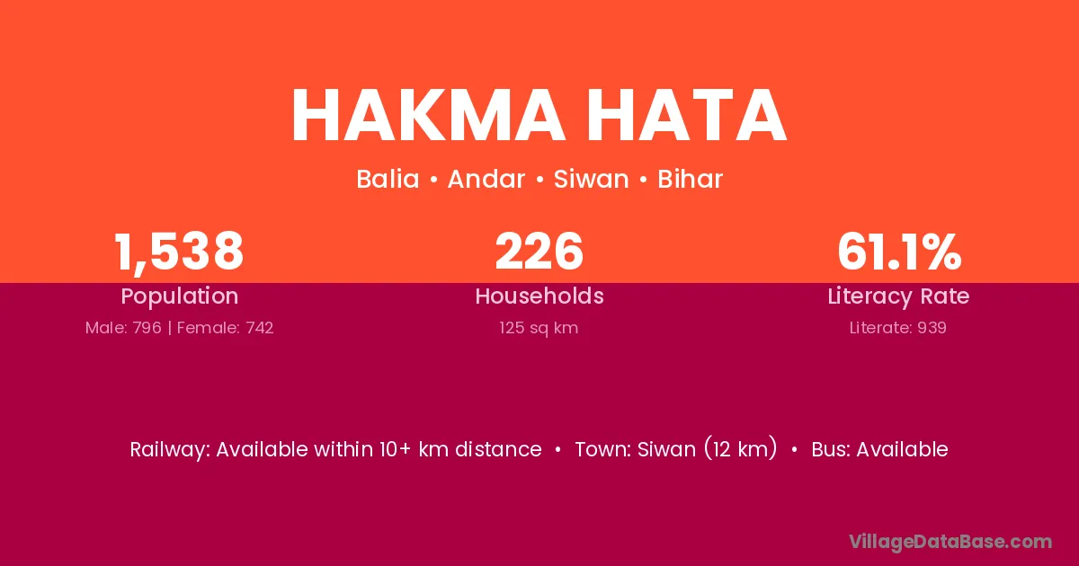 Siwan (12 km) is the nearest town to Hakma Hata village for major economic activities and is located approximately 12 km away.