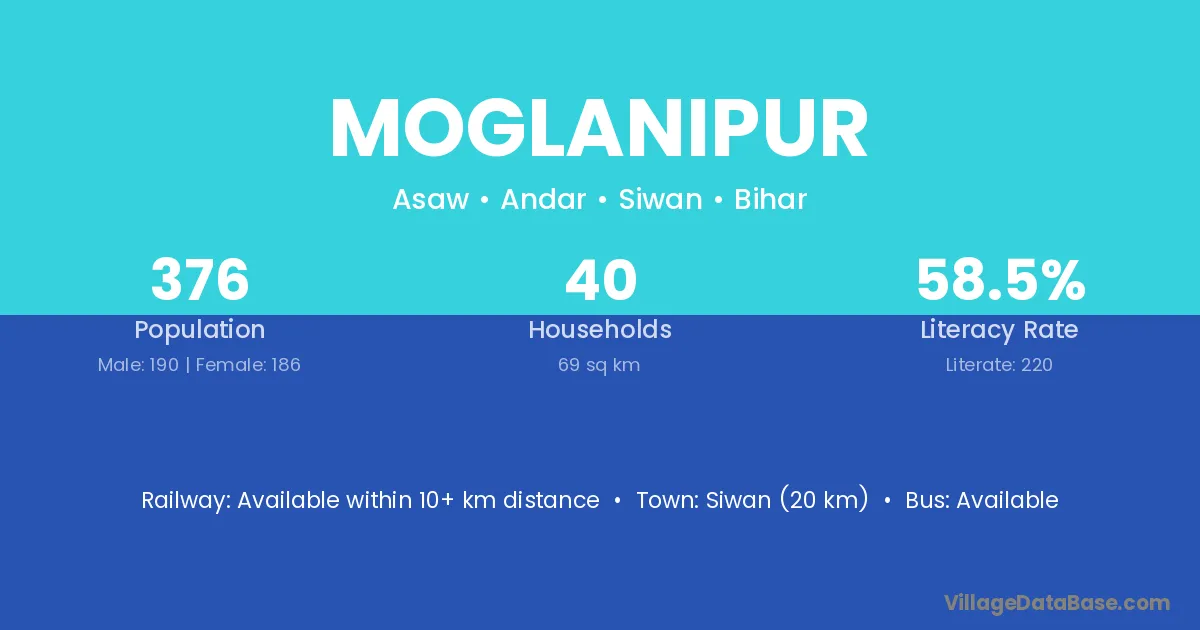 Siwan (20 km) is the nearest town to Moglanipur village for major economic activities and is located approximately 20 km away.