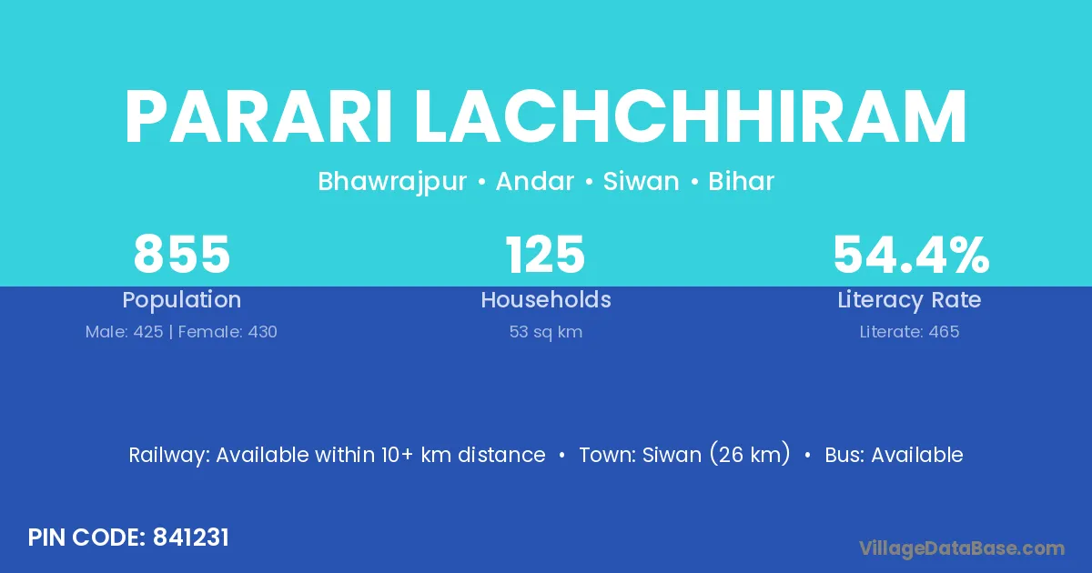 Parari Lachchhiram village has a total population of 855 people, of which 425 are males and 430 are females.