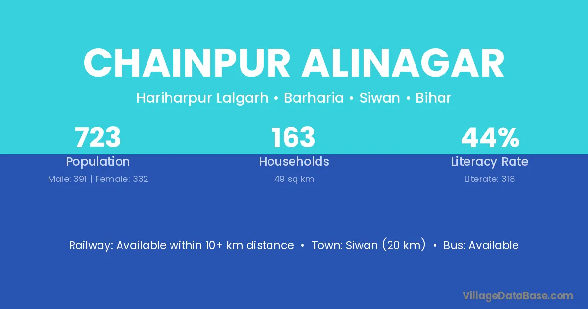 Siwan (20 km) is the nearest town to Chainpur Alinagar village for major economic activities and is located approximately 20 km away.