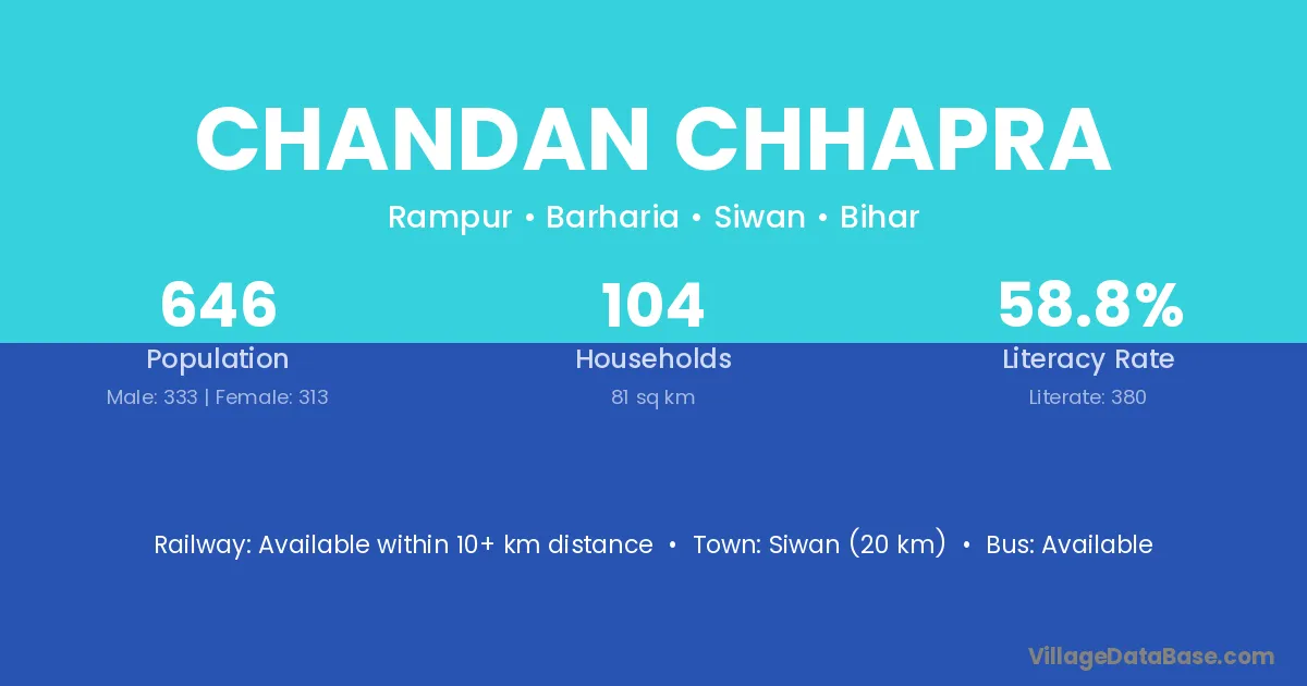 Siwan (20 km) is the nearest town to Chandan Chhapra village for major economic activities and is located approximately 20 km away.