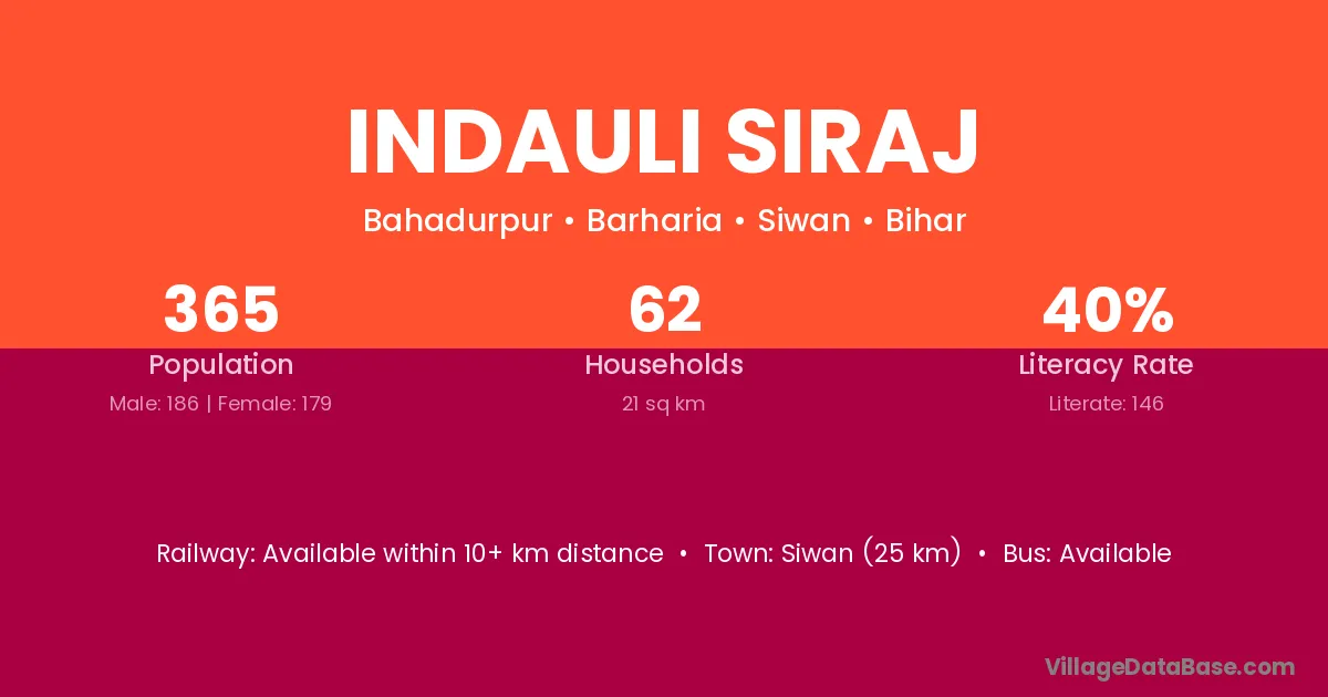 Siwan (25 km) is the nearest town to Indauli Siraj village for major economic activities and is located approximately 25 km away.