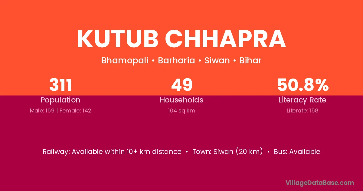Siwan (20 km) is the nearest town to Kutub Chhapra village for major economic activities and is located approximately 20 km away.