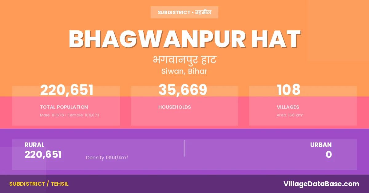 According to the 2011 census The total area of Bhagwanpur Hat Subdivision is 158 km², with a population of 220651 people. The population density is 1,394 inhabitants per square kilometre, and there are approximately 35669 houses in the sub district.