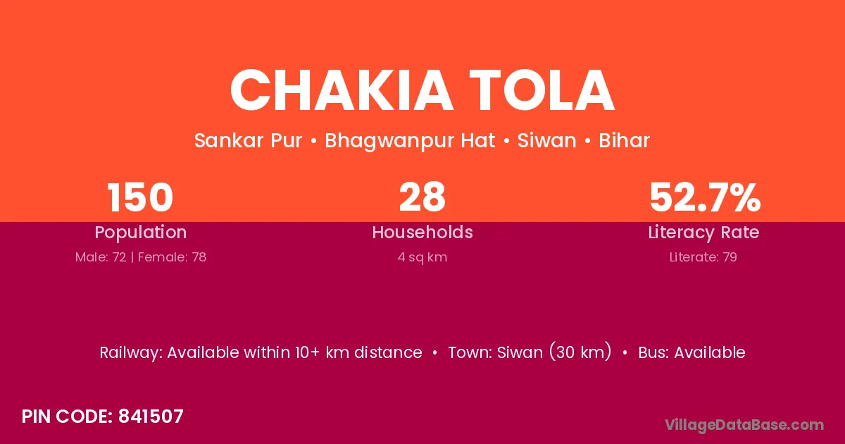 Siwan (30 km) is the nearest town to Chakia Tola village for major economic activities and is located approximately 30 km away.