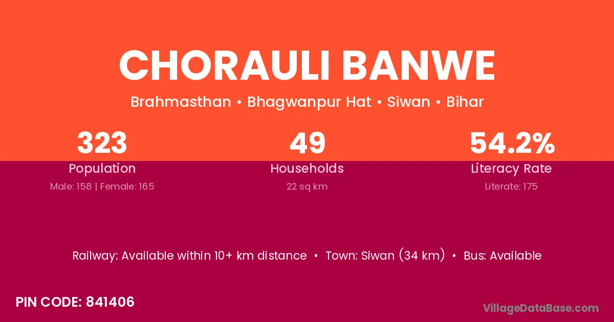 Siwan (34 km) is the nearest town to Chorauli Banwe village for major economic activities and is located approximately 34 km away.