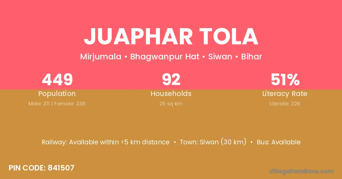 Siwan (30 km) is the nearest town to Juaphar Tola village for major economic activities and is located approximately 30 km away.