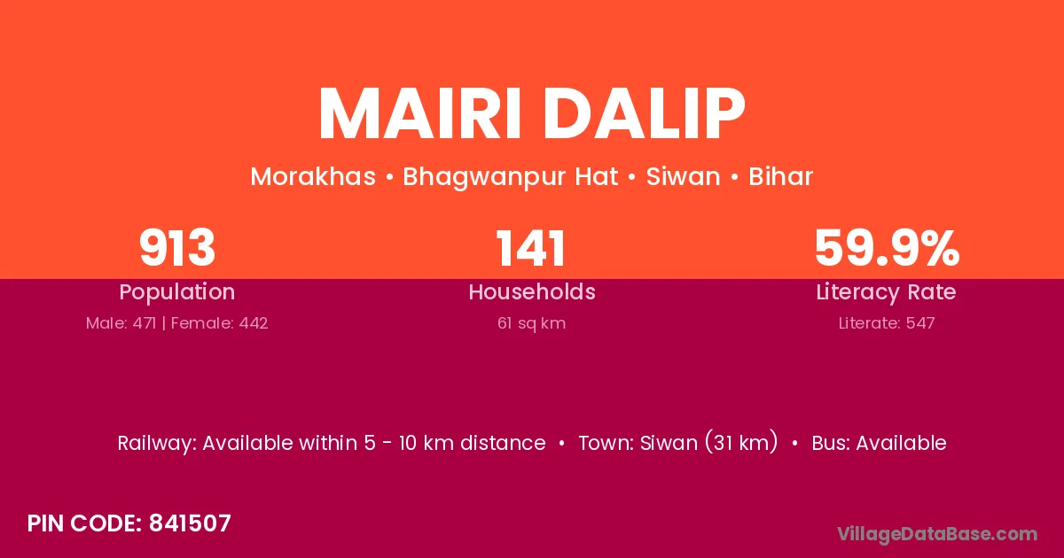 Siwan (31 km) is the nearest town to Mairi Dalip village for major economic activities and is located approximately 31 km away.