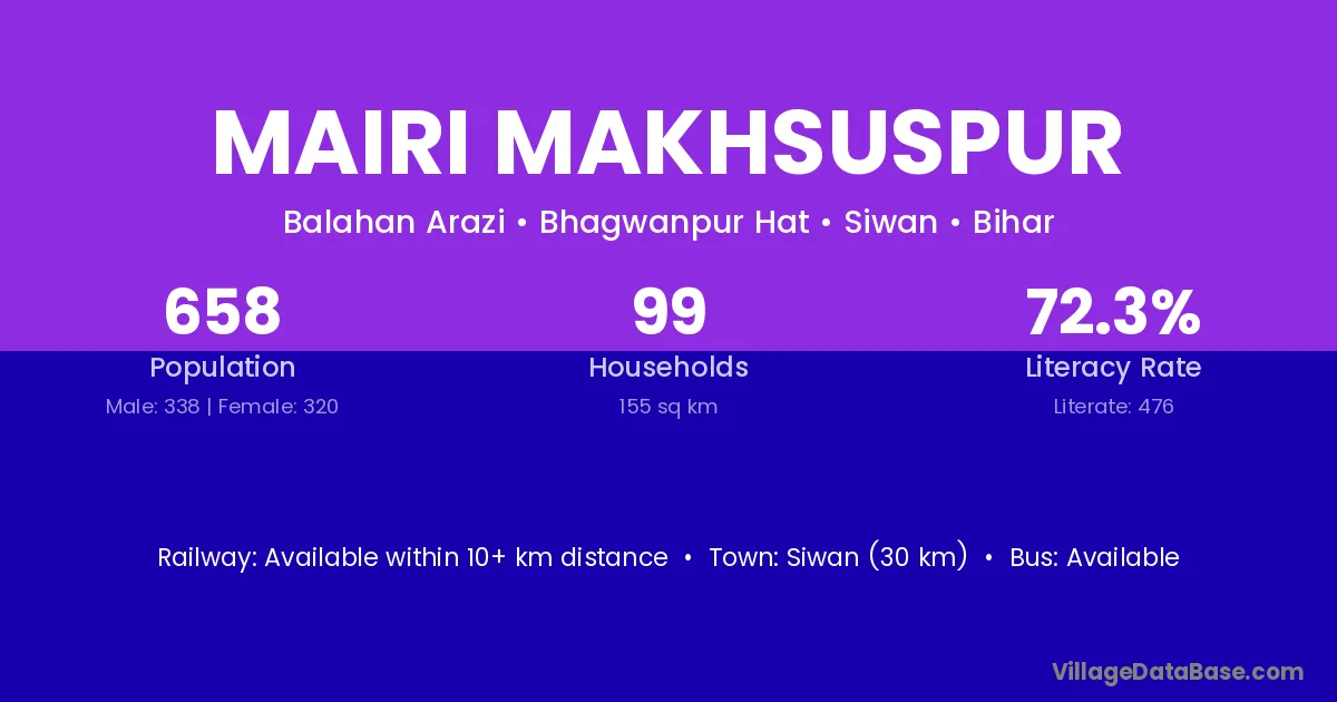 Siwan (30 km) is the nearest town to Mairi Makhsuspur village for major economic activities and is located approximately 30 km away.