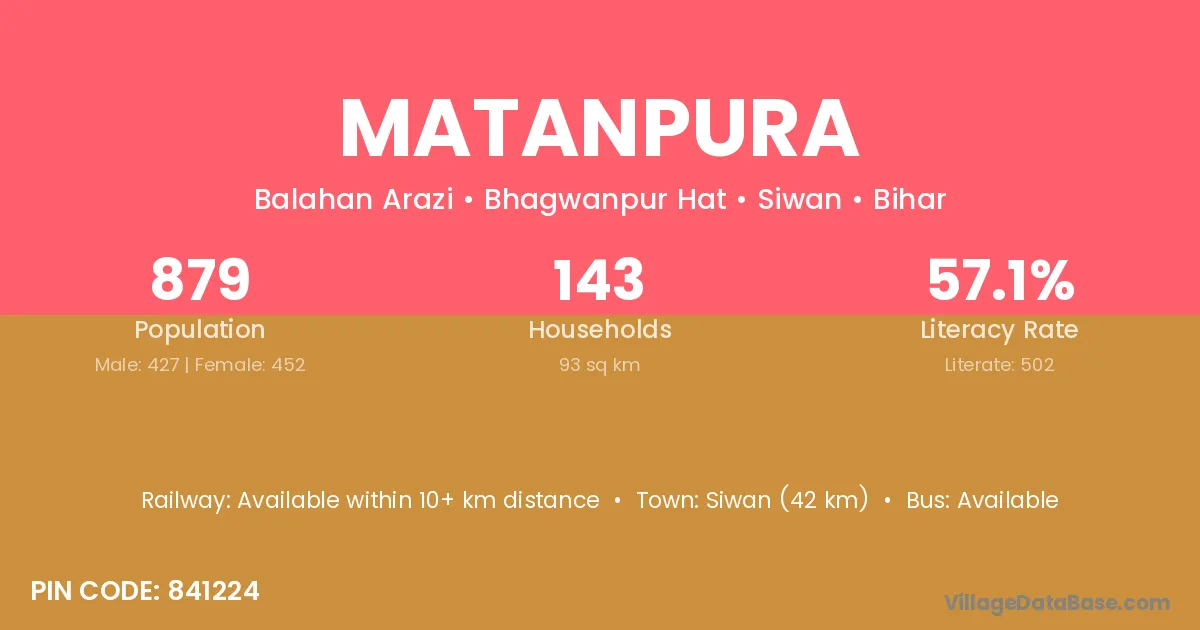 Siwan (42 km) is the nearest town to Matanpura village for major economic activities and is located approximately 42 km away.