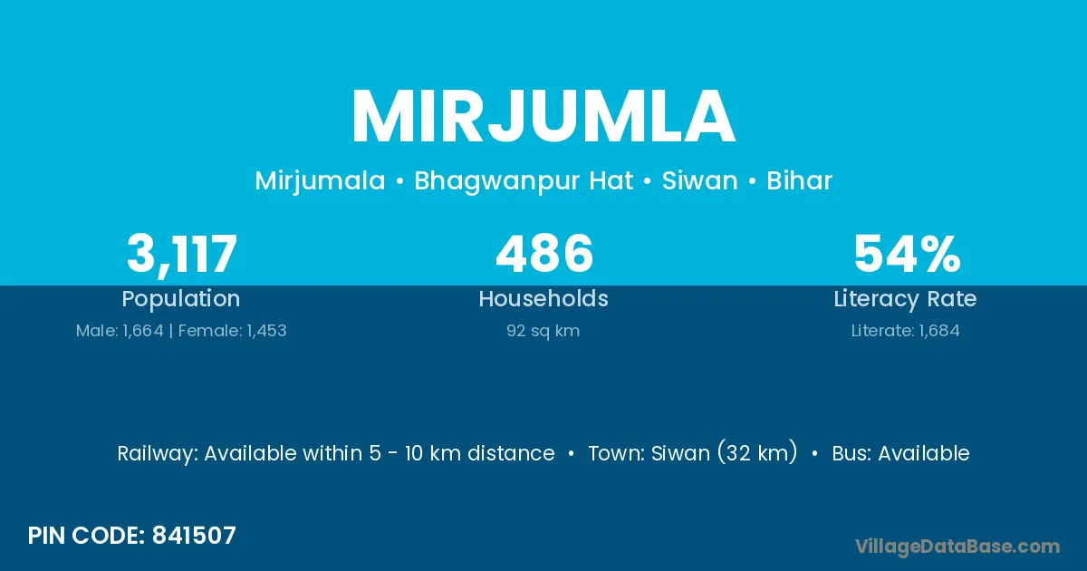 Siwan (32 km) is the nearest town to Mirjumla village for major economic activities and is located approximately 32 km away.