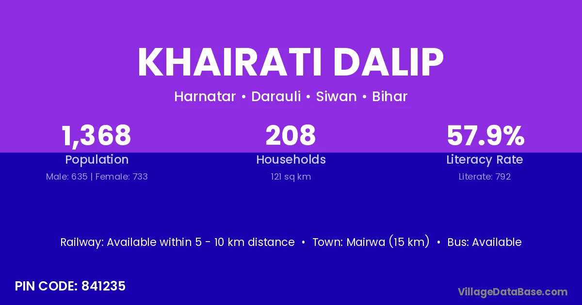 Mairwa (15 km) is the nearest town to Khairati Dalip village for major economic activities and is located approximately 15 km away.
