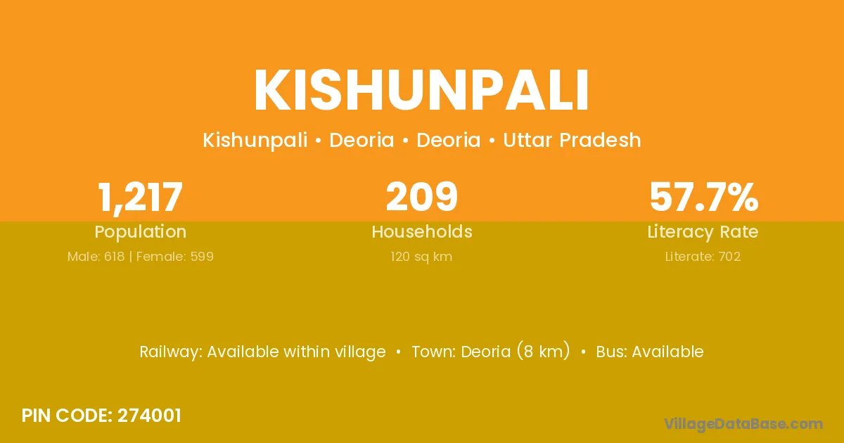 The literacy rate of Kishunpali village is 57.14%. Male literacy stands at 66.11% and female literacy at 47.42%.