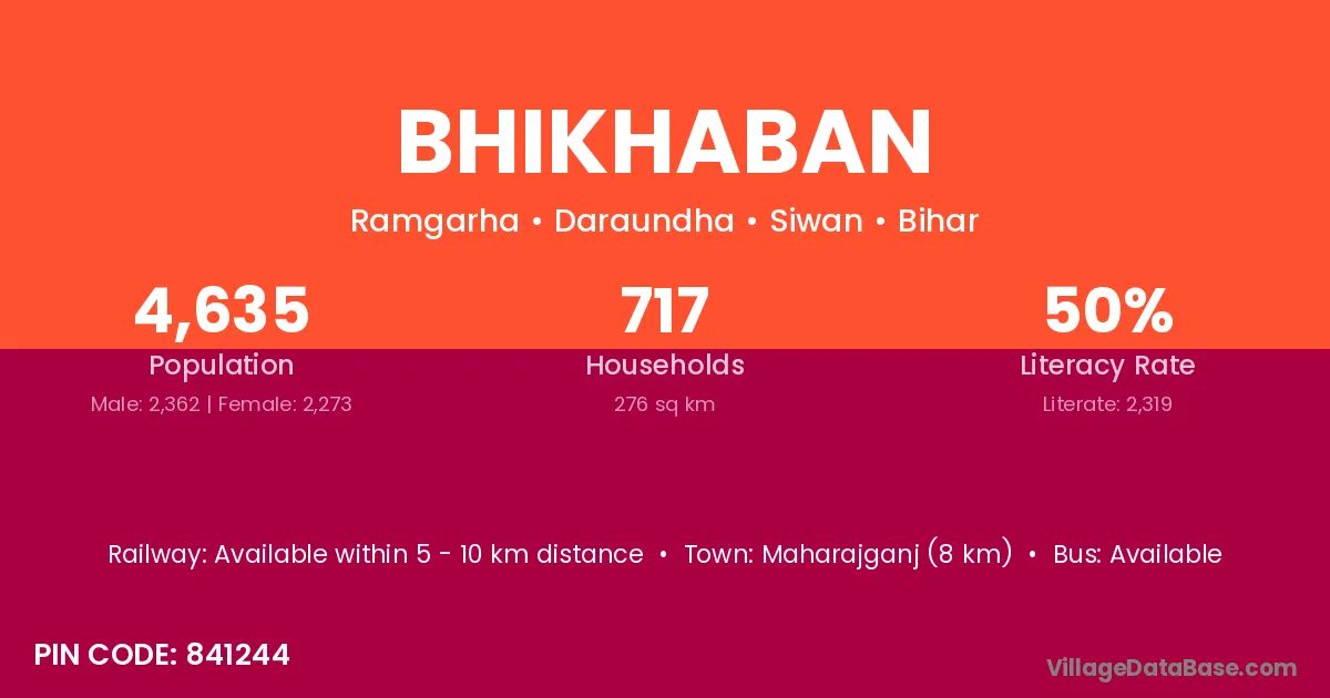 Maharajganj (8 km) is the nearest town to Bhikhaban village for major economic activities and is located approximately 8 km away.