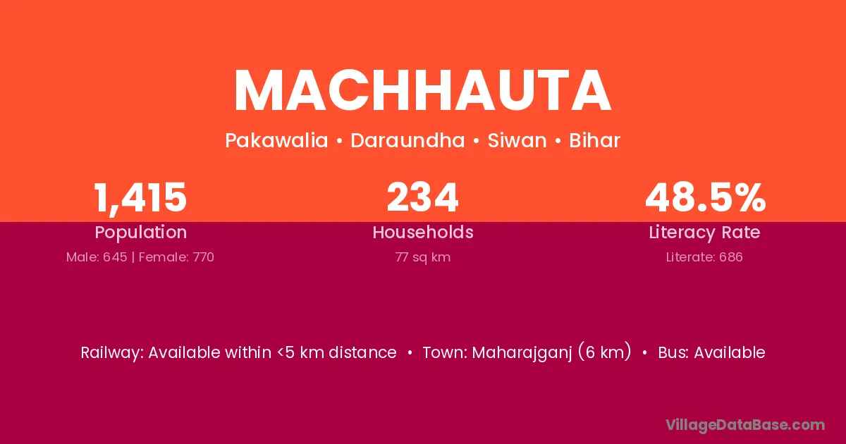 Machhauta village has a total population of 1,415 people, of which 645 are males and 770 are females.