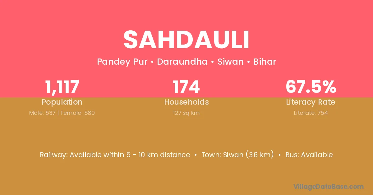 Siwan (36 km) is the nearest town to Sahdauli village for major economic activities and is located approximately 36 km away.