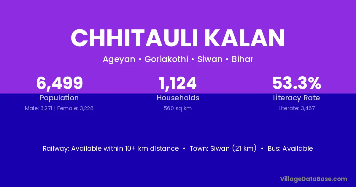 Siwan (21 km) is the nearest town to Chhitauli Kalan village for major economic activities and is located approximately 21 km away.