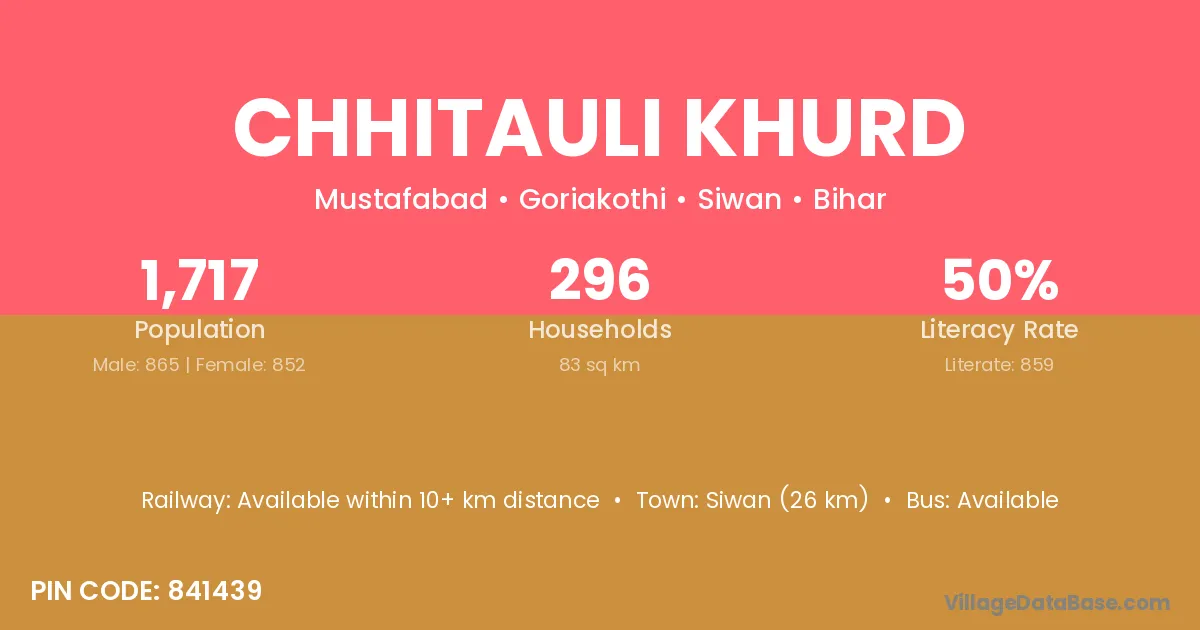 Siwan (26 km) is the nearest town to Chhitauli Khurd village for major economic activities and is located approximately 26 km away.