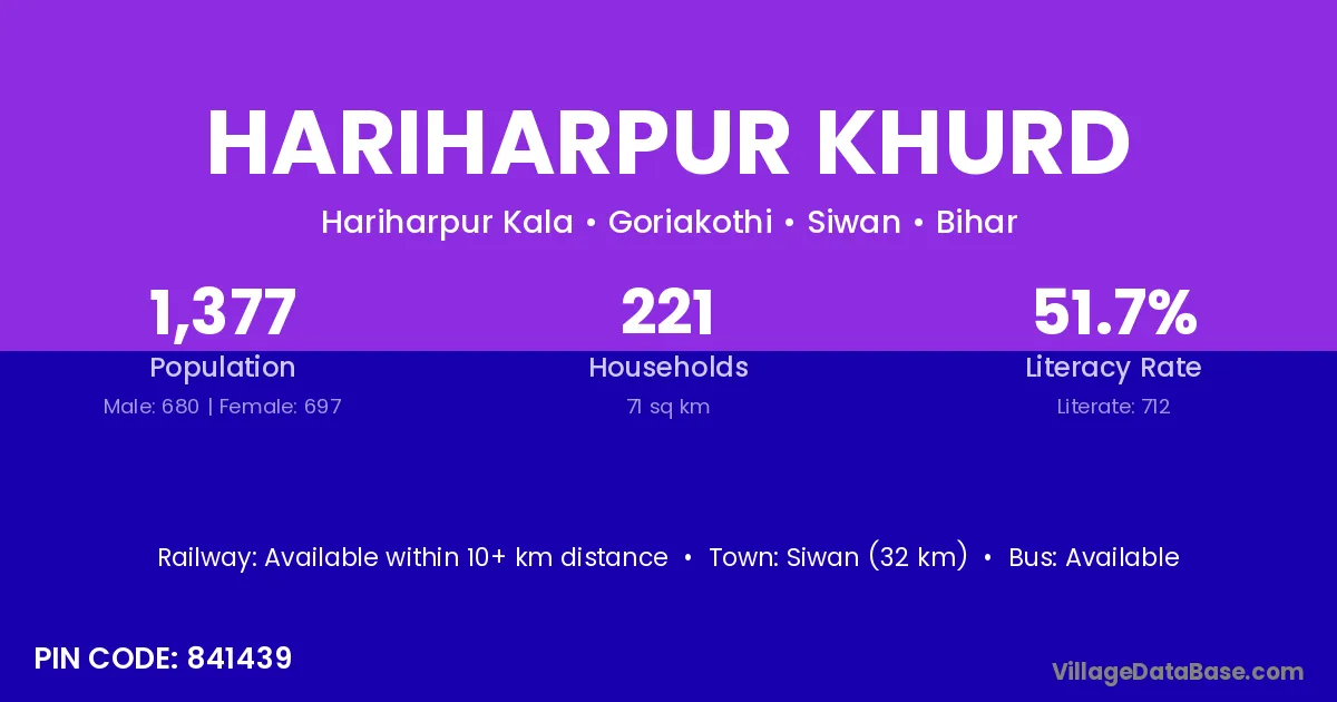Siwan (32 km) is the nearest town to Hariharpur Khurd village for major economic activities and is located approximately 32 km away.