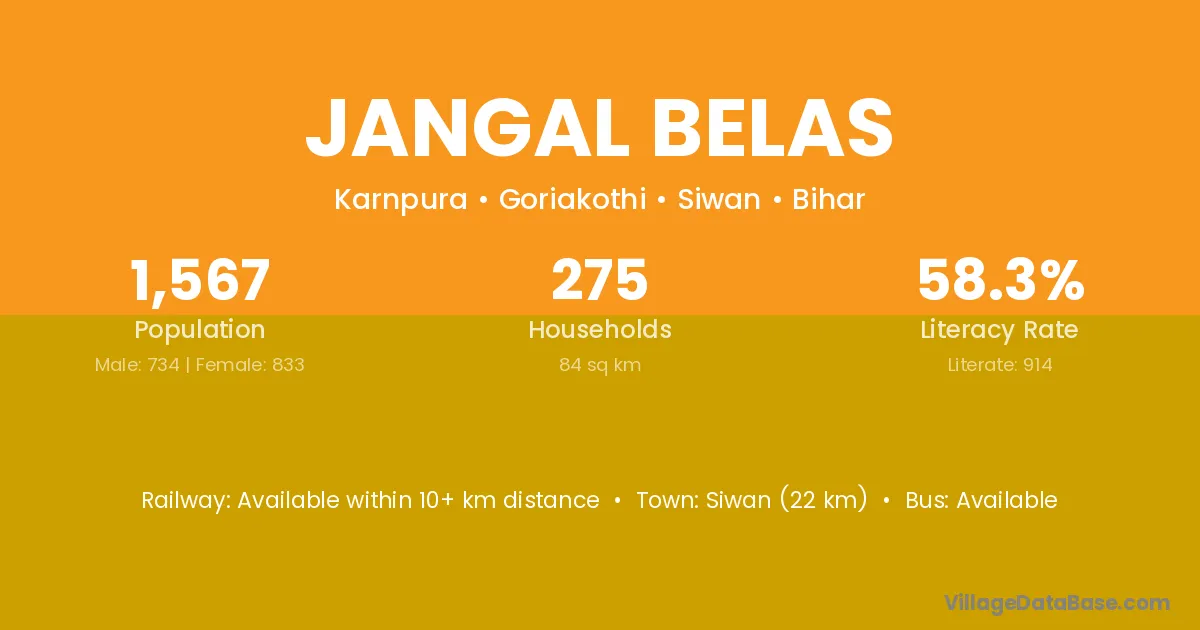 Siwan (22 km) is the nearest town to Jangal Belas village for major economic activities and is located approximately 22 km away.