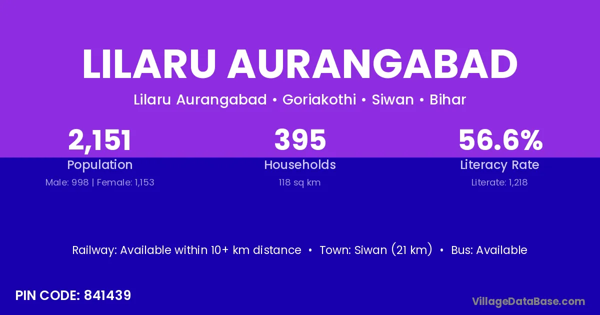 Siwan (21 km) is the nearest town to Lilaru Aurangabad village for major economic activities and is located approximately 21 km away.