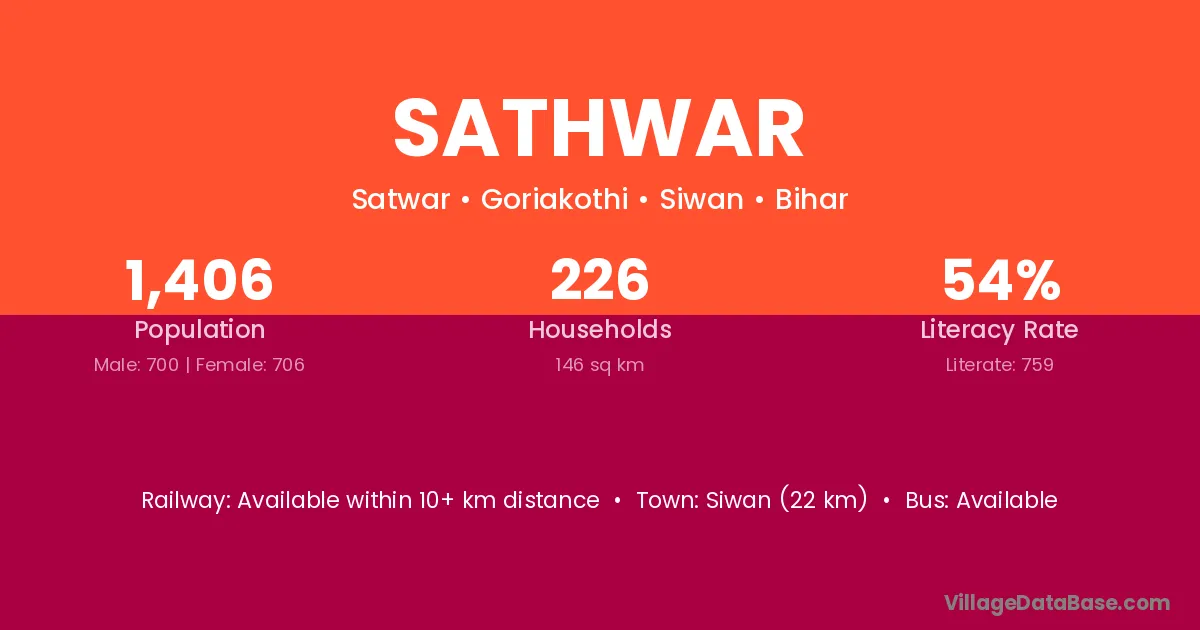 Siwan (22 km) is the nearest town to Sathwar village for major economic activities and is located approximately 22 km away.