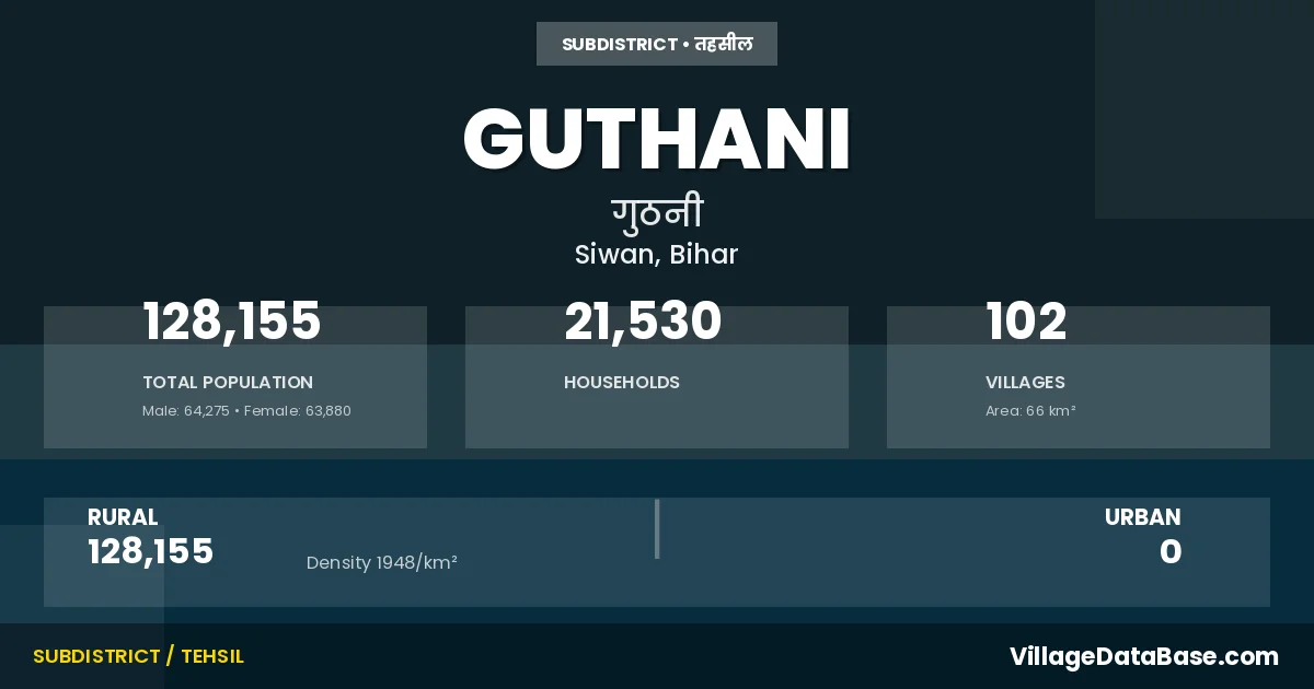 Guthani is a town and Subdivision in the Siwan district of the Bihar. In India, a Subdivision is a subdivision of a district responsible for the administration and revenue collection of a specific area within the district. Subdivisions play a crucial role in the local governance structure, contributing significantly to the development and administration of their communities.