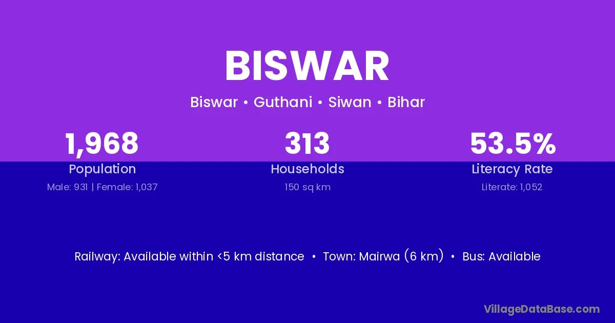 Mairwa (6 km) is the nearest town to Biswar village for major economic activities and is located approximately 6 km away.