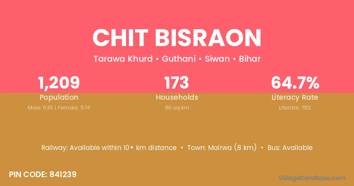 Mairwa (8 km) is the nearest town to Chit Bisraon village for major economic activities and is located approximately 8 km away.