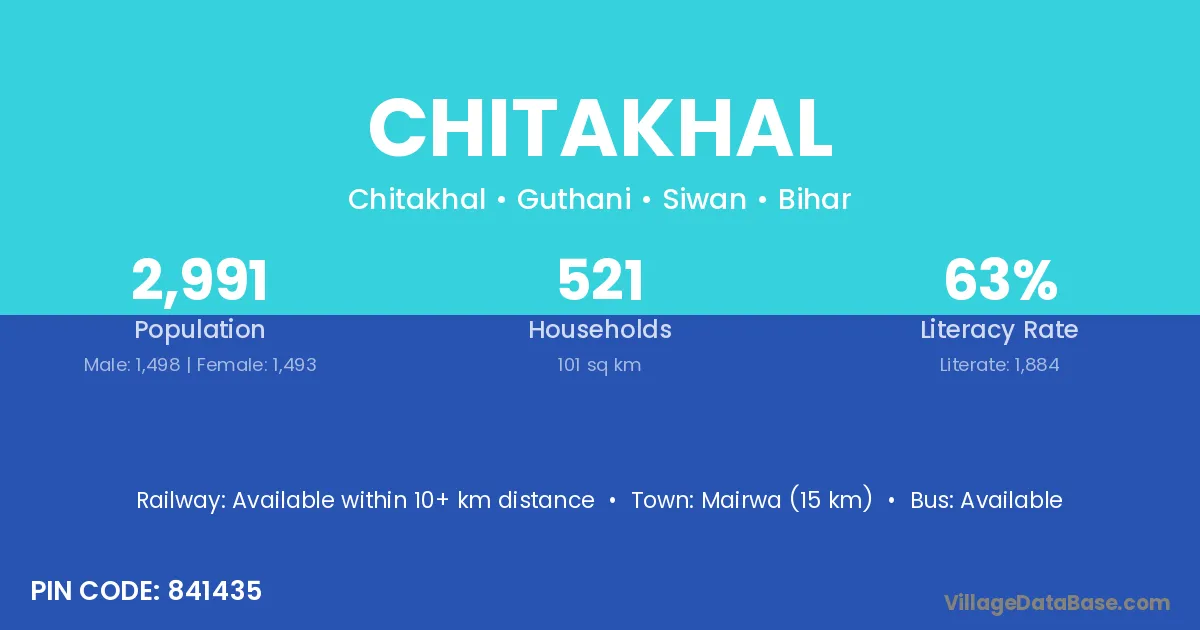 Mairwa (15 km) is the nearest town to Chitakhal village for major economic activities and is located approximately 15 km away.