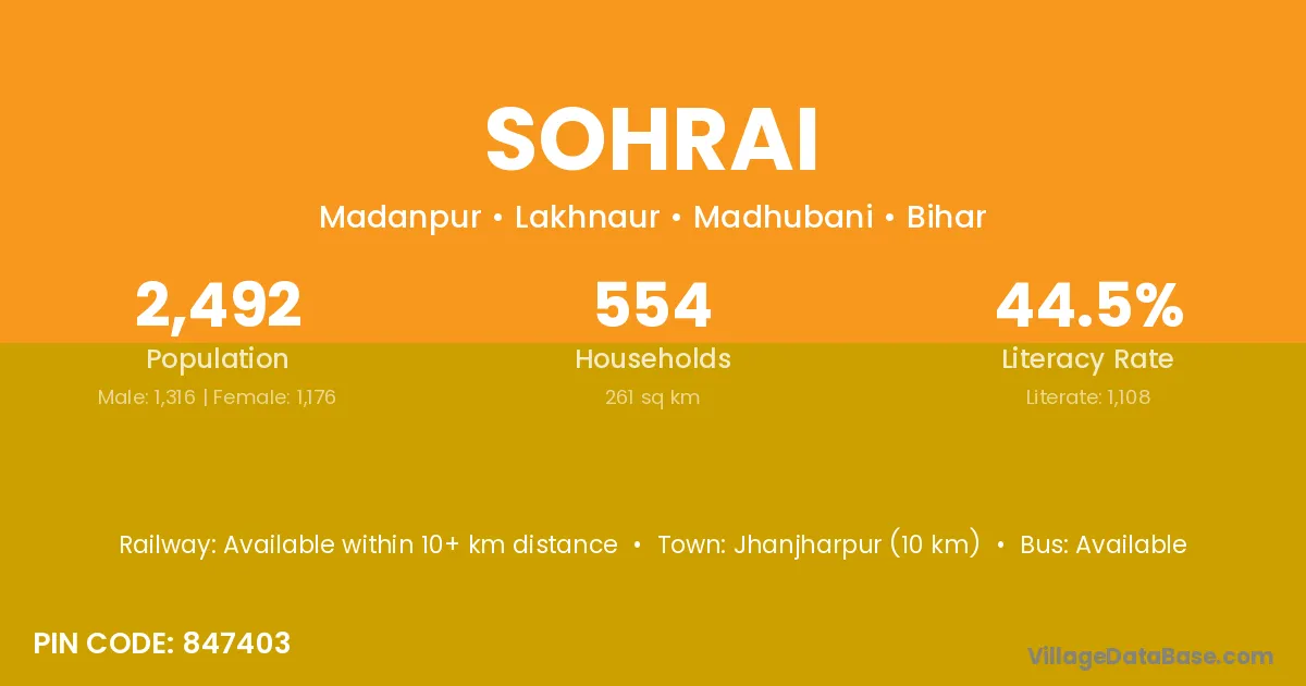 Mairwa (4 km) is the nearest town to Sohrai village for major economic activities and is located approximately 4 km away.