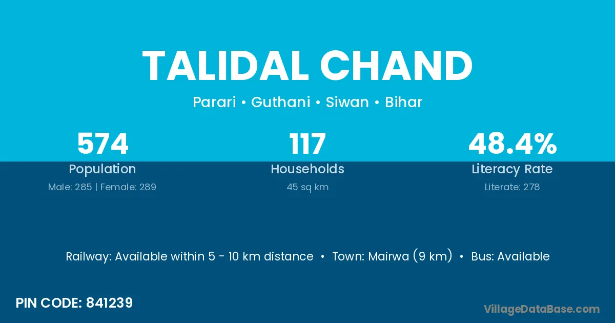 Mairwa (9 km) is the nearest town to Talidal Chand village for major economic activities and is located approximately 9 km away.