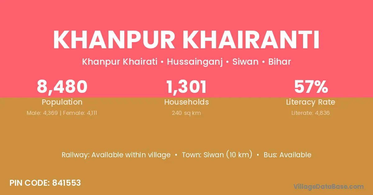 Siwan (10 km) is the nearest town to Khanpur Khairanti village for major economic activities and is located approximately 10 km away.