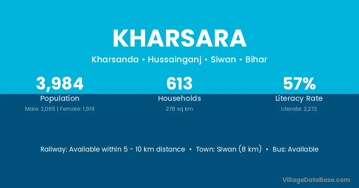 Siwan (8 km) is the nearest town to Kharsara village for major economic activities and is located approximately 8 km away.