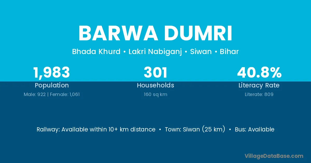 Siwan (25 km) is the nearest town to Barwa Dumri village for major economic activities and is located approximately 25 km away.