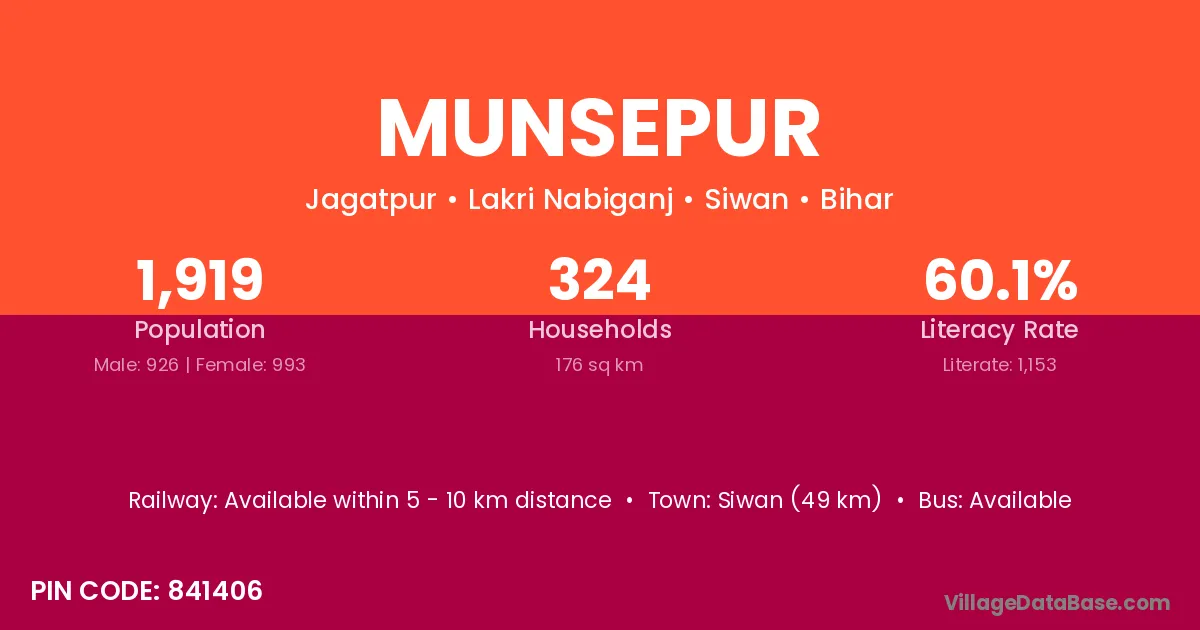 Siwan (49 km) is the nearest town to Munsepur village for major economic activities and is located approximately 49 km away.