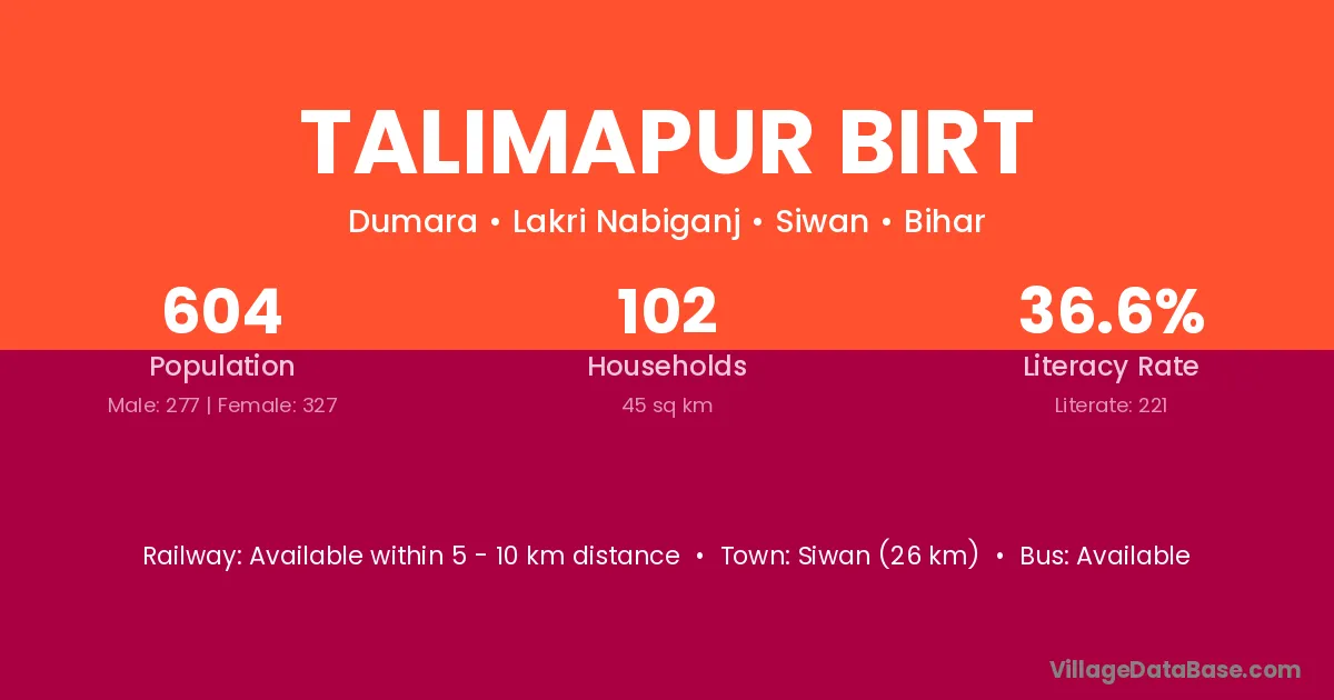 Talimapur Birt village has a total population of 604 people, of which 277 are males and 327 are females.