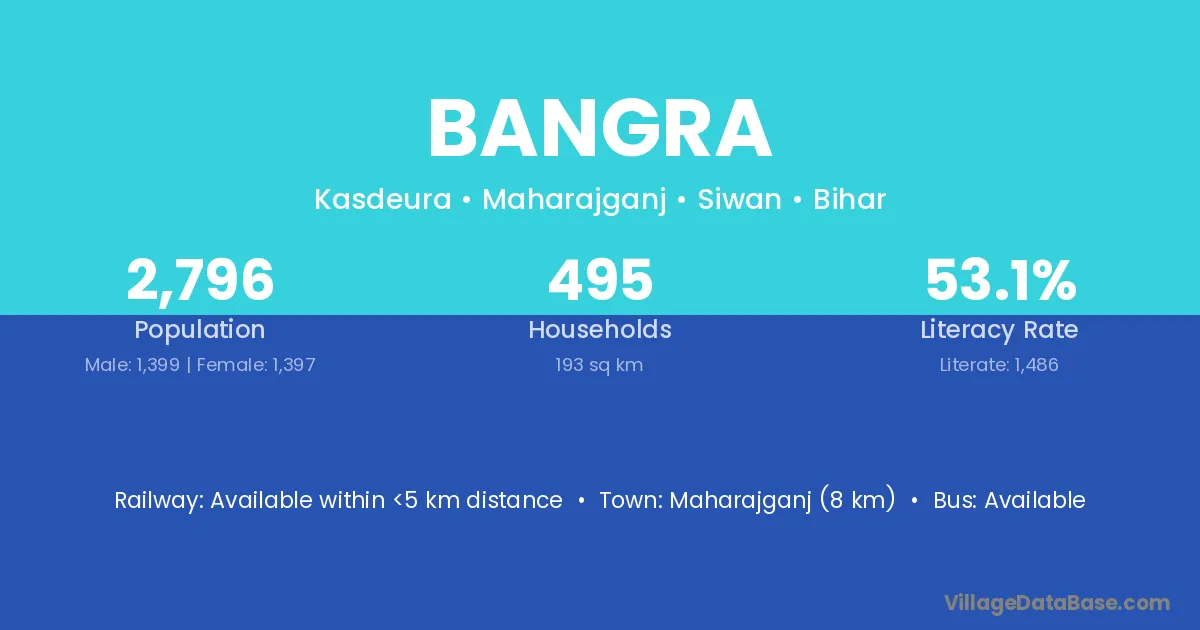 Maharajganj (8 km) is the nearest town to Bangra village for major economic activities and is located approximately 8 km away.