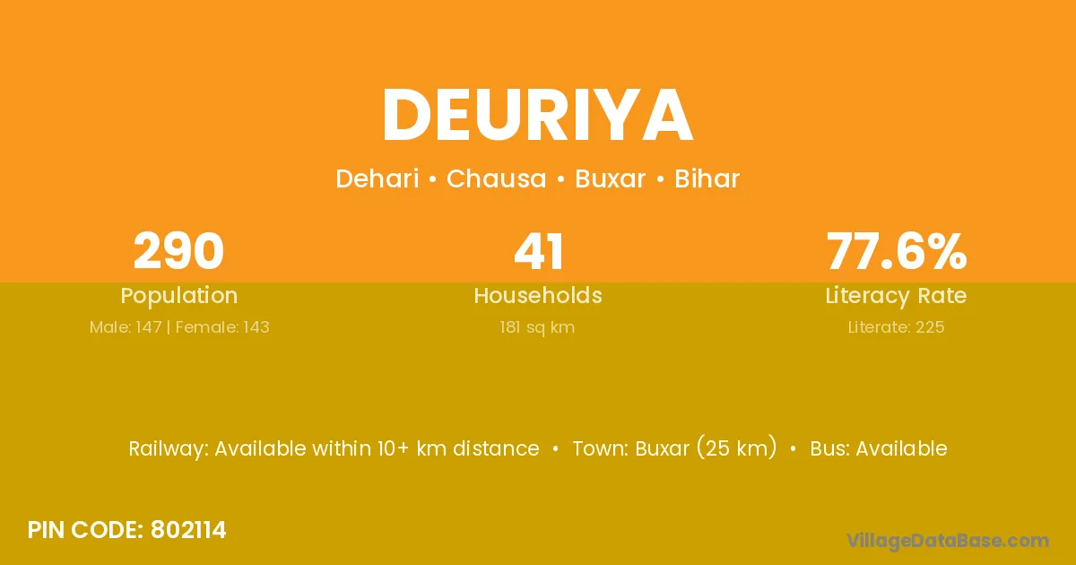 Deuriya village has a total population of 6,209 people, of which 3,072 are males and 3,137 are females.