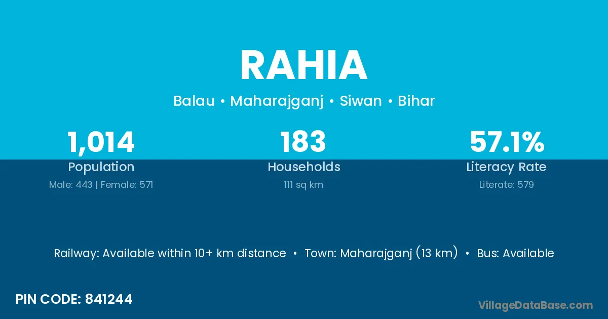Maharajganj (13 km) is the nearest town to Rahia village for major economic activities and is located approximately 13 km away.