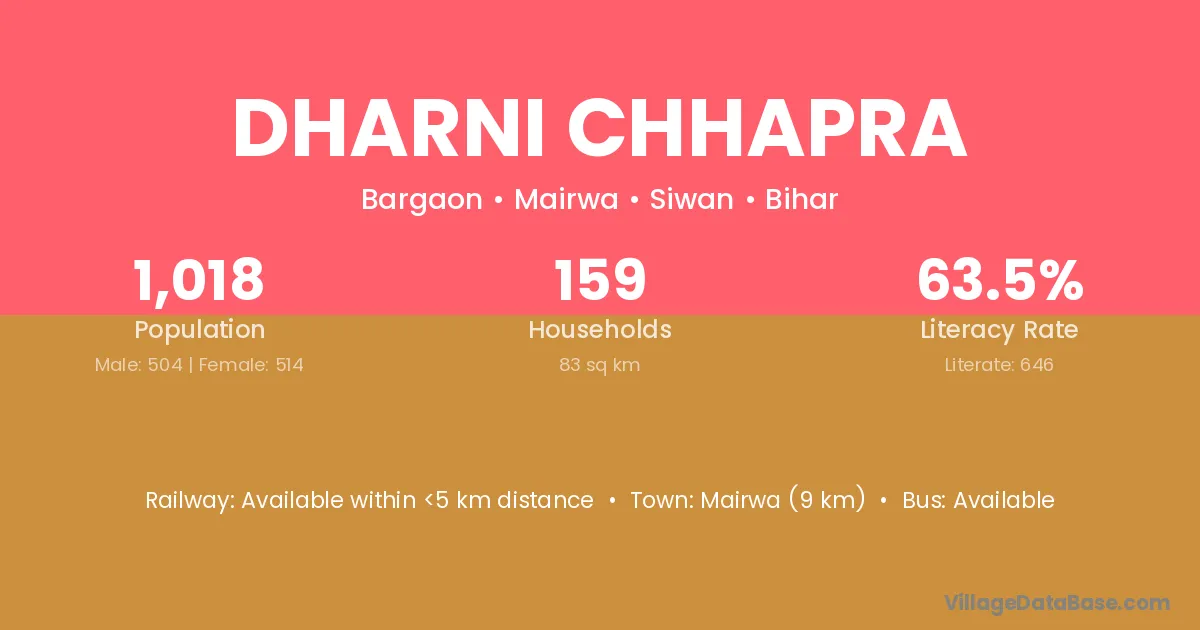 Mairwa (9 km) is the nearest town to Dharni Chhapra village for major economic activities and is located approximately 9 km away.