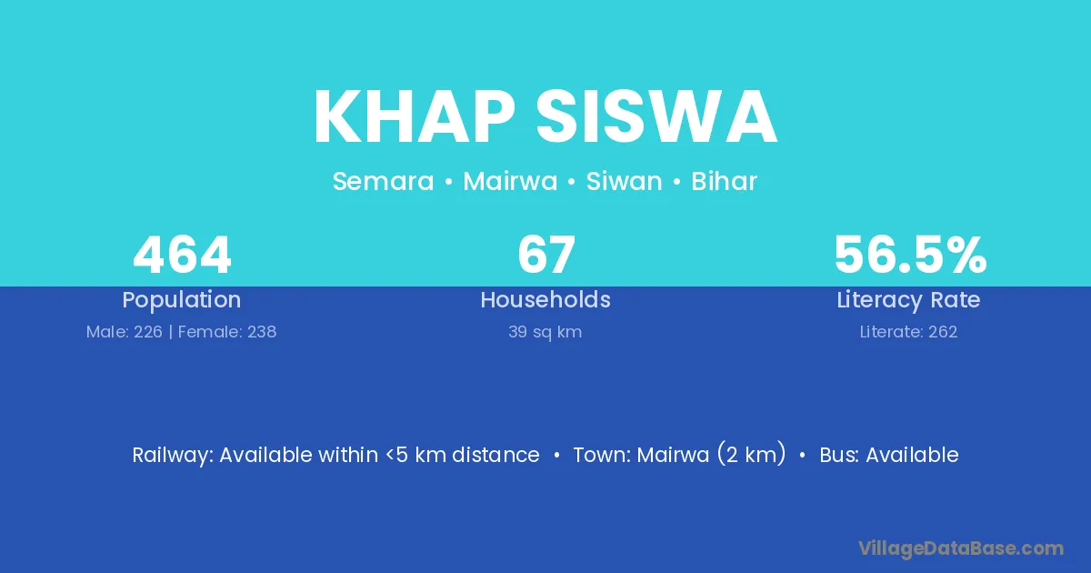 Mairwa (2 km) is the nearest town to Khap Siswa village for major economic activities and is located approximately 2 km away.