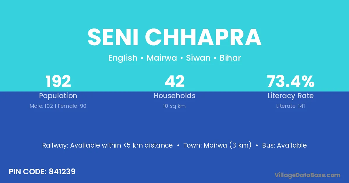 Mairwa (3 km) is the nearest town to Seni Chhapra village for major economic activities and is located approximately 3 km away.