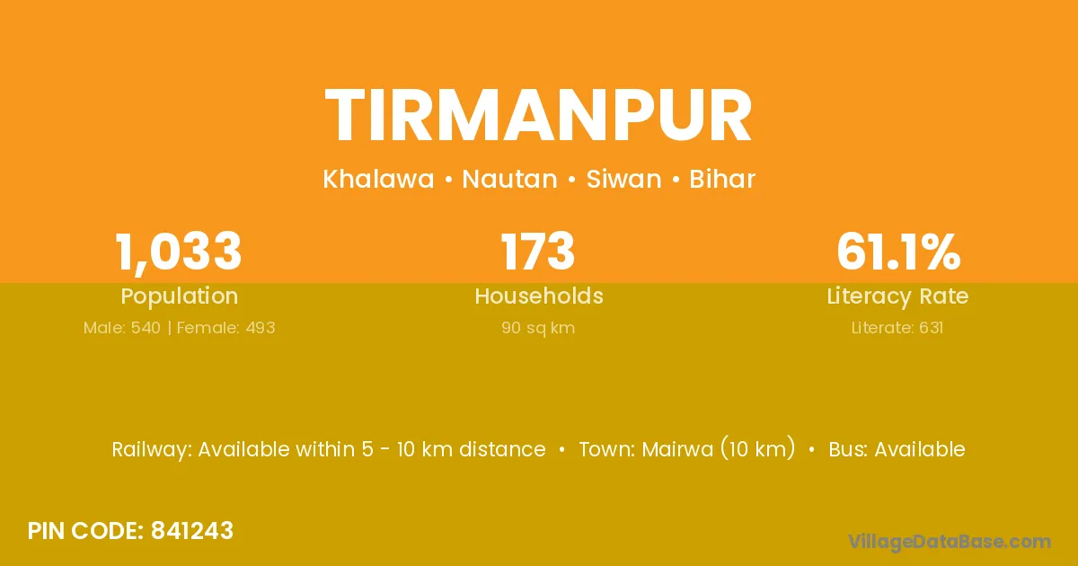 Mairwa (10 km) is the nearest town to Tirmanpur village for major economic activities and is located approximately 10 km away.