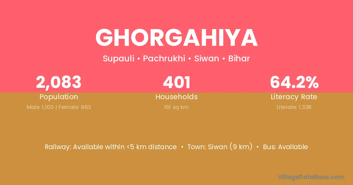 Siwan (9 km) is the nearest town to Ghorgahiya village for major economic activities and is located approximately 9 km away.