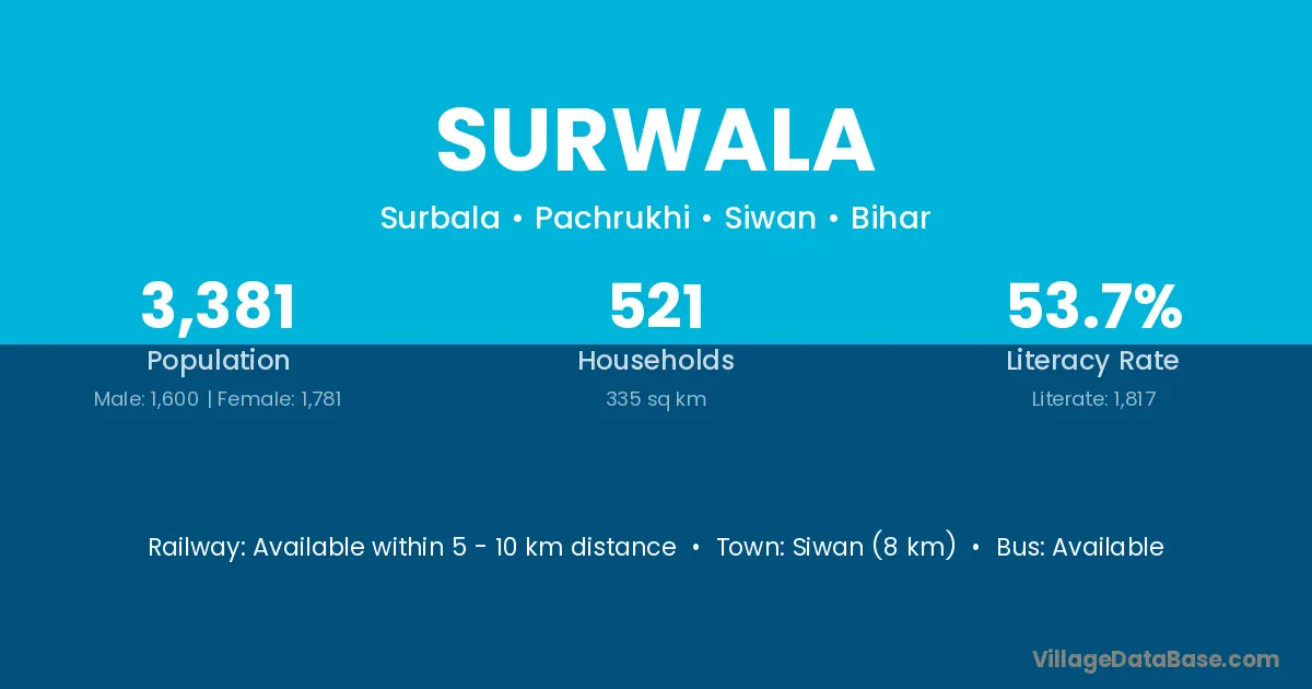 Siwan (8 km) is the nearest town to Surwala village for major economic activities and is located approximately 8 km away.